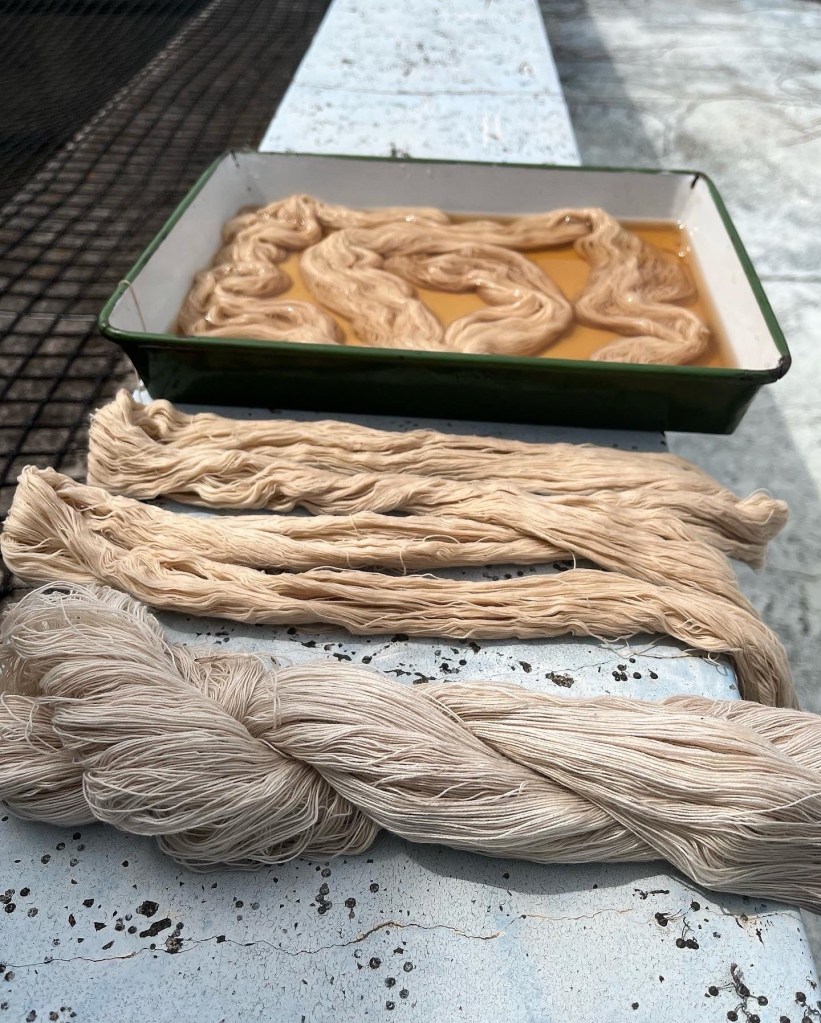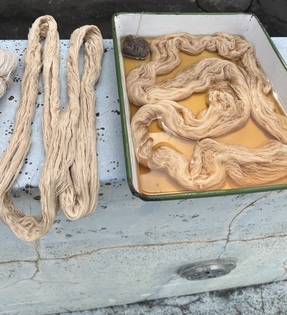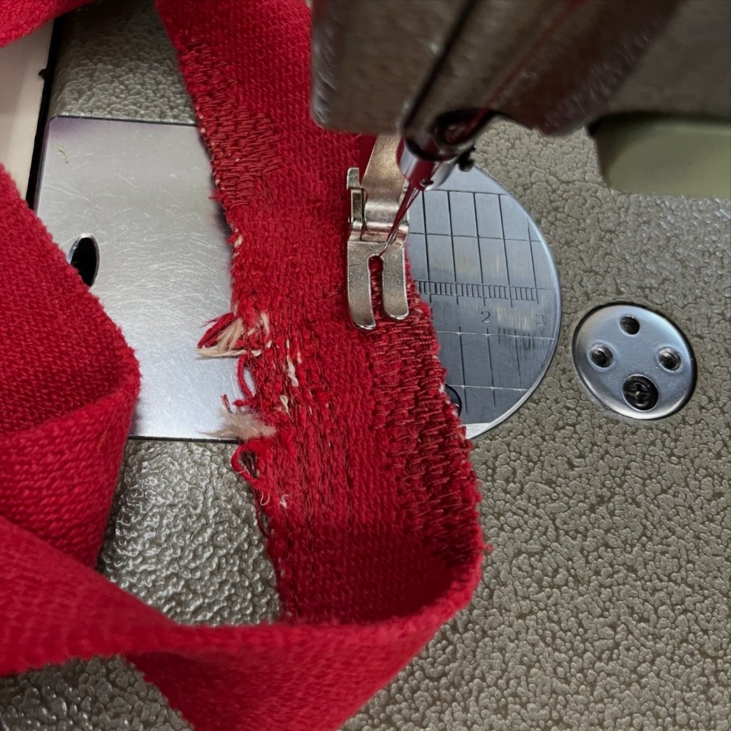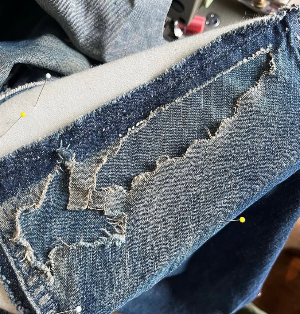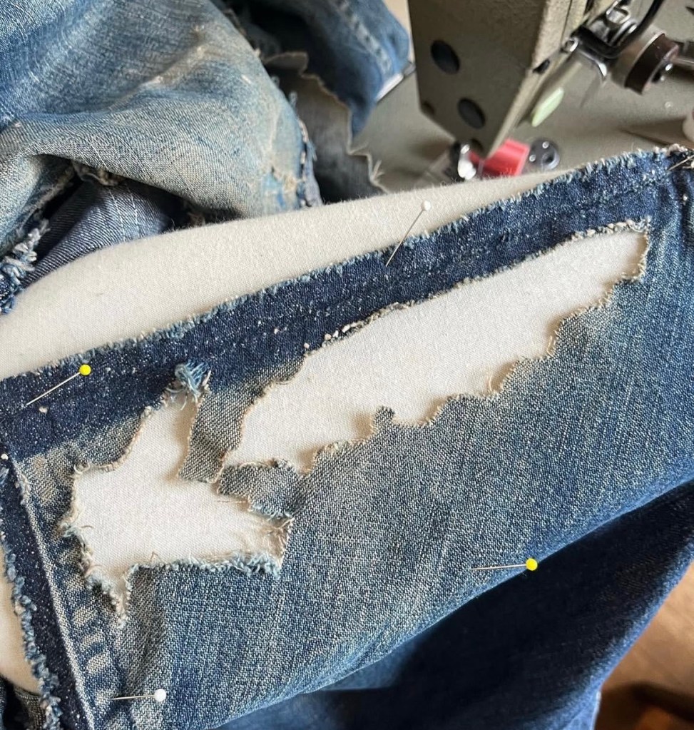 破れに従いながら、手縫いのリペアmendingと、ミシンによるタタキリペアの組み合わせ
